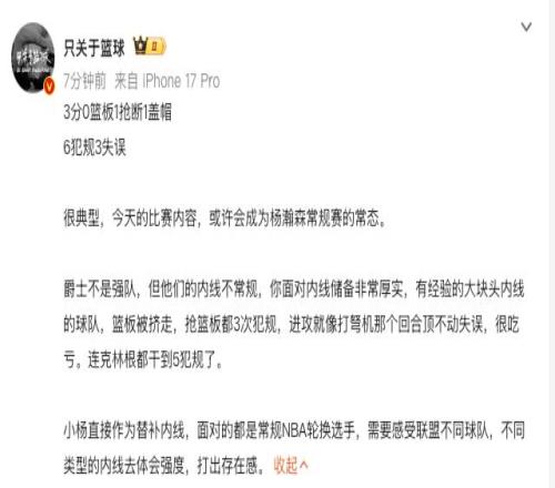 媒体人“只关于篮球”发文点评了杨瀚森的表现: