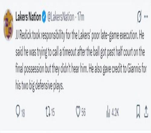 湖媒:雷迪克根本没有请求暂停,这才是我对湖人失去信心的原因之一。这场比赛真的糟透了。
